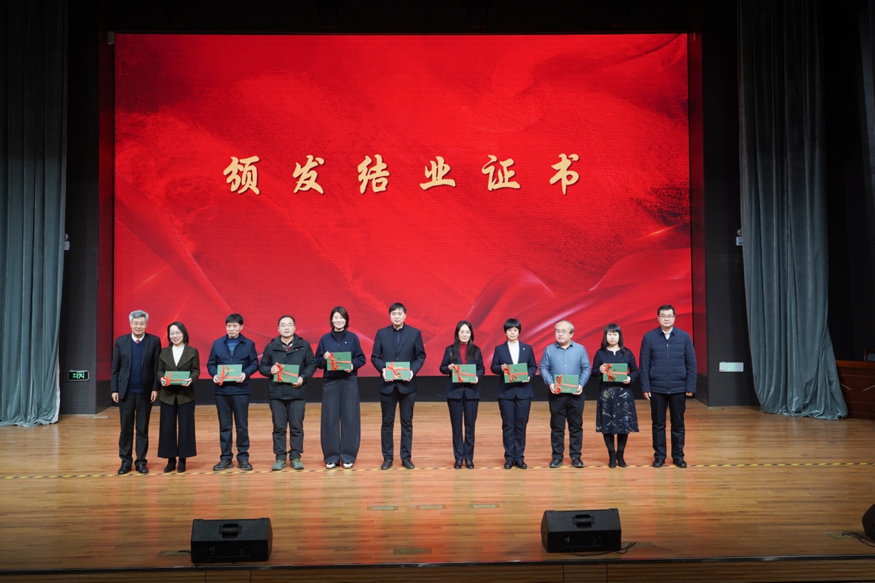 在展示环节,8位教师校长代表、2个优秀小组,分别围绕教育思想提升、教学成果凝练、科研能力发展、团队共建共享、实践浸润成长、辐射引领带动、课堂育人实践等主题作了生动汇报,展示了项目对校长教师专业成长、学校治理提升与区域教育发展的多维推动。最后,樊平军副院长和于维涛主任为学员代表颁发了结业证书,标志着首期“双名工程”圆满收官。