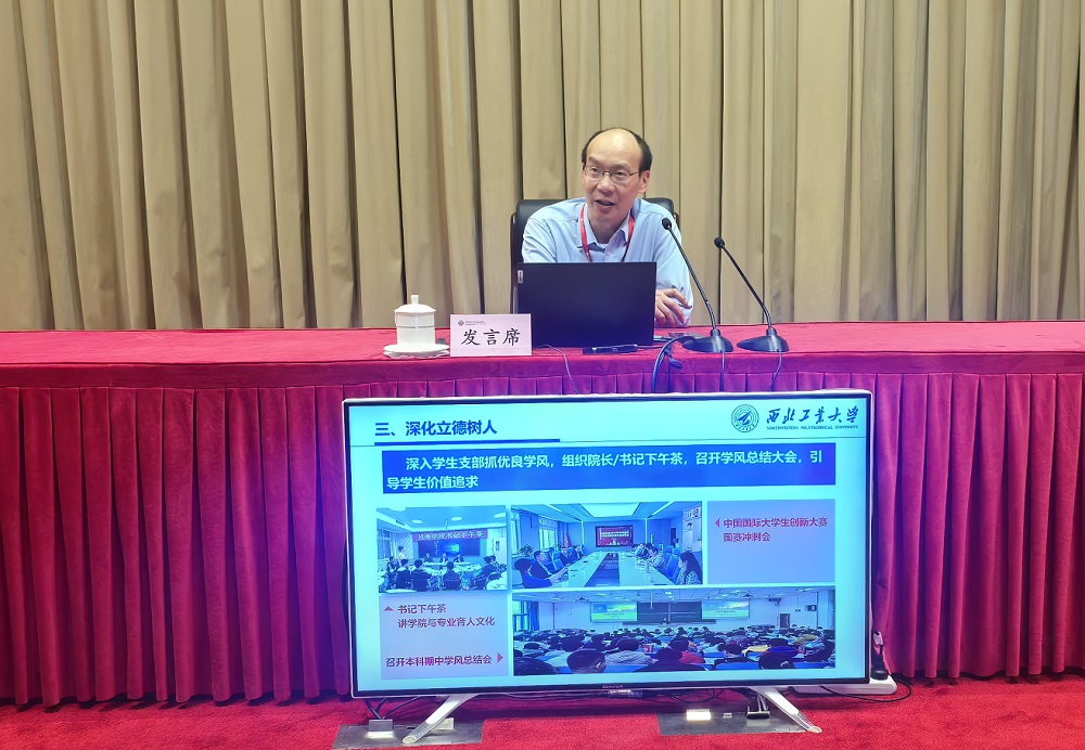 西北工业大学机电学院副院长罗明以“党建引领促发展、团结奋进创一流”为题,交流发言简要介绍了学校的基本情况,然后重点围绕强化政治引领、坚持党管人才、深化立德树人、融促科技创新、党风文化建设五个方面交流了以党建引领各项业务发展、建设一流学院的总体思路和具体做法。