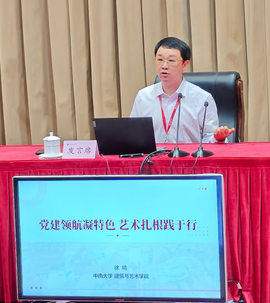 中南大学建筑与艺术学院副院长徐鸣以“党建引领应战略凝特色,入脑入心将设计在祖国大地上”为题,介绍中南大学建筑与艺术学院坚持以党的创新理论为指导,紧密对接国家战略,发挥基层党组织和党员先锋模范作用,依托学科与资源优势,不断凝练专业核心竞争力。通过推动理论内化于心、外化于行,引导艺术创作扎根祖国大地,将学科发展成果转化为服务人民、贡献国家的坚实力量。